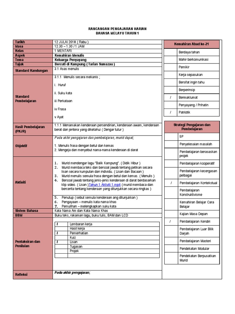 Download Rpt Bahasa Melayu Tahun 1 Berguna Rph Bm Tahun 1 Pkjr Documents Skoloh